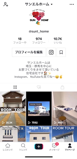 TikTokでは主にモデルハウス、完成したお家などのROOM TOURを早送りでの動画で投稿してます