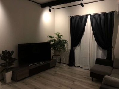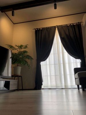 梁下に伸ばしたライティングレールの照明とシックなカーテン、観葉植物が良い感じに合わさって