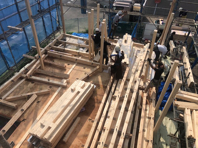 今日は暑い中、上棟でした 木材がたくさん。。。