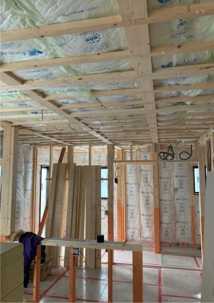 こんにちは!工事の小林です。今日は、鴻巣市のI様邸の進捗状況です。昨日断熱検査が完了しました。今日から石膏ボード張りを開始します。
