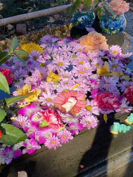 花手水といいまして、神社などで水がないときに葉や花で手をこすって
