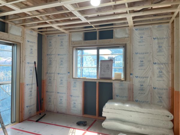 現場には大工さんがいて、ちょうど断熱材を入れているところでした!