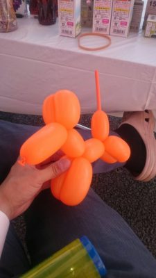 今、お越し頂くともれなく、永井さん手作り風船プレゼントです。考えてる顔
