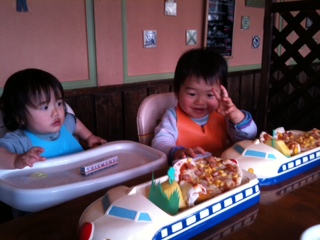 お子様ランチの新幹線プレートを見て喜び
