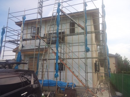 こんにちは。工事の小林です。加須市О様邸の工事の進捗です。外は透湿シートと胴縁の施工まで完了しました。また、本日第三者機関の躯体検査を受けました。特に不具合もなく、合格しました。