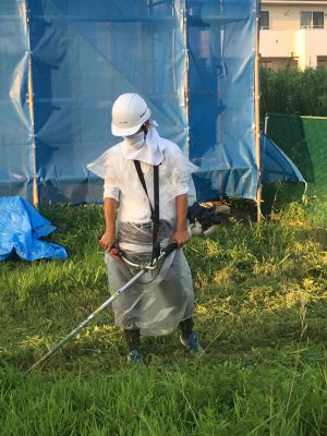 杉本さん、完全装備の草刈り姿です