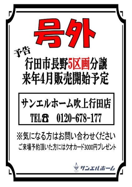来年4月販売開始予定の行田市長野5区画分譲をご報告させて頂きます
