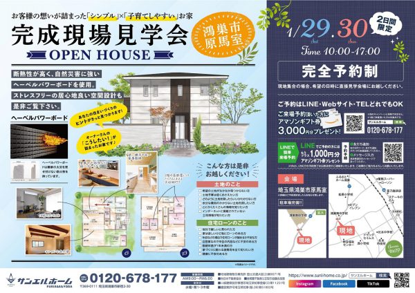 今月吹上行田店にて、鴻巣市原馬室にて「完成見学会」を開催致します