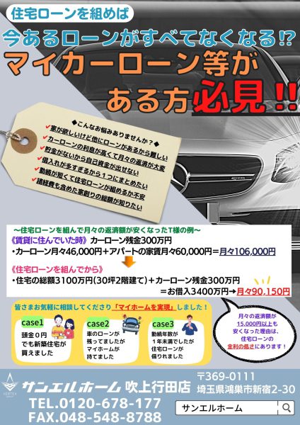 どれくらいローンが残っているかにもよるので、カーローン等が残っているけど新築も欲しいという方はお気軽にご相談ください