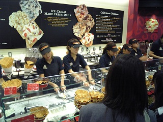 がコールドストーンの上でアイスとトッピングのフルーツやケーキ、チョコチップなどを混ぜて気が向けば歌を歌いながら作ってくれます!