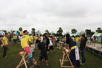 丸太を切る早さを競います【ちょー疲れます】