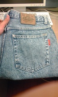 (右:犬のチェックのネルシャツ、左:ケミカルウォッシュジーンズ)