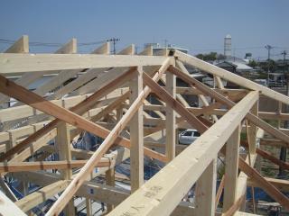 2階の屋根まで形になったら合板を