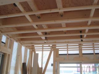 お家の中の天井を大工さんが作っています