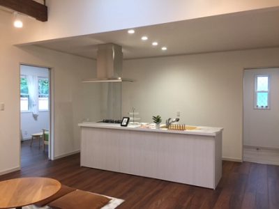 アイランドキッチンもとっても開放的で、天窓もあるので明るいリビングですうれしい顔指でOK