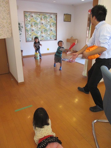 どんぐりたくさん拾った後は事務所で野球をやりました