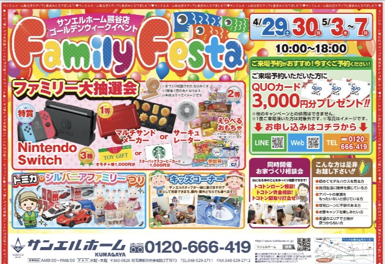 Nintendo SWICHI等、豪華賞品が当たるファミリー大抽選会は5月7日(日)までです。