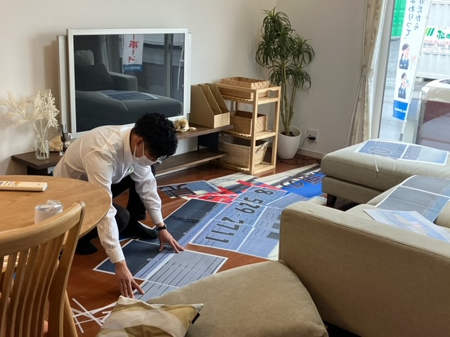 熊谷店の道路沿いにある大きな看板を見学会用に高田さんが作っています。
