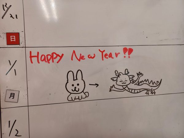熊谷店に2週間の予定がかけるホワイトボードがあるのですが、1/1の予定のところに、卯と辰の顔を書いたのですが、胴体がいつの間にか追加されていて、、、