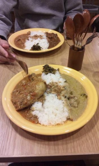 こちらはチキントマトとグリーンカレーのあい盛りです