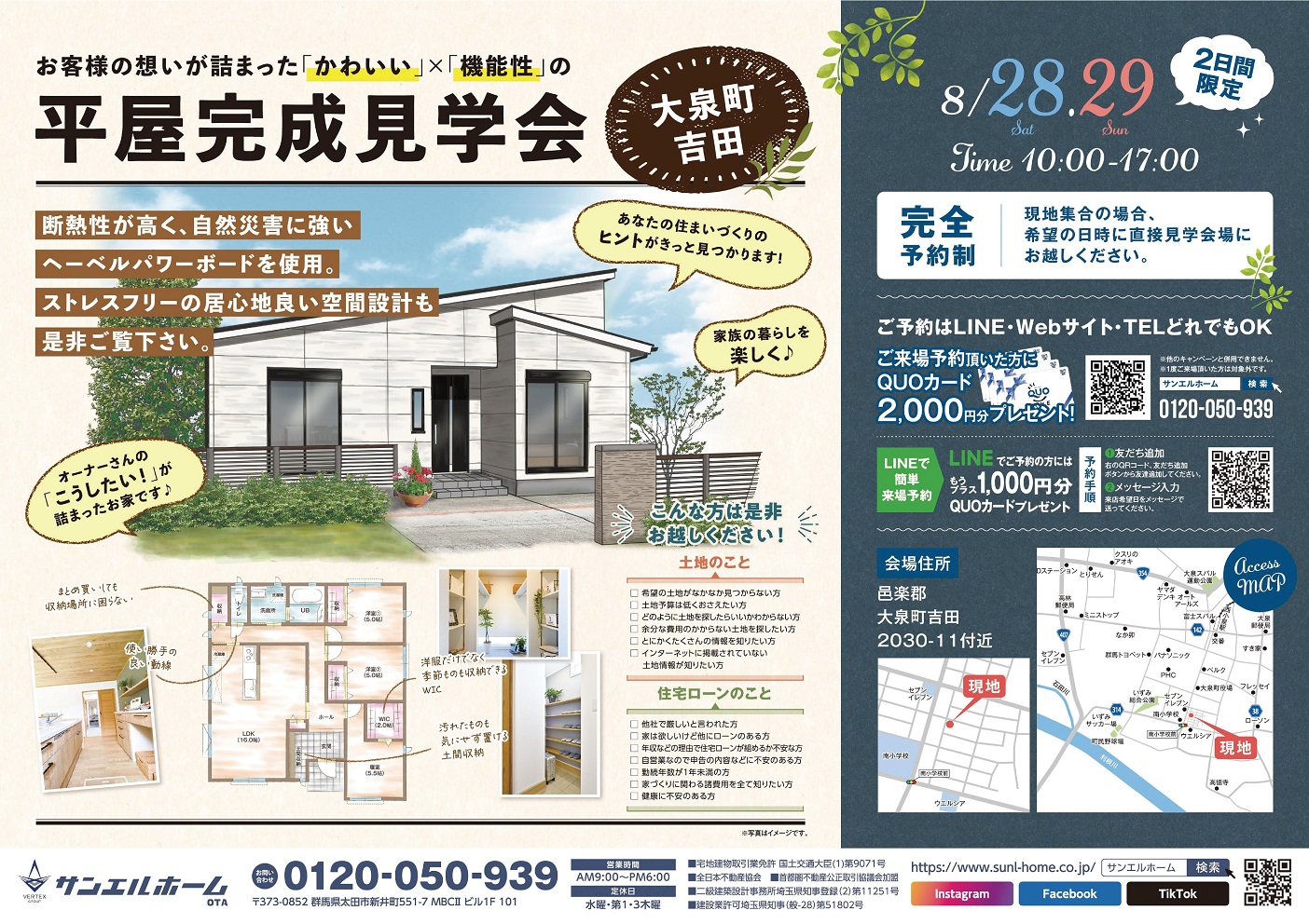 今月の末に群馬県邑楽郡大泉町にて開催される平屋のお家の見学会用チラシが