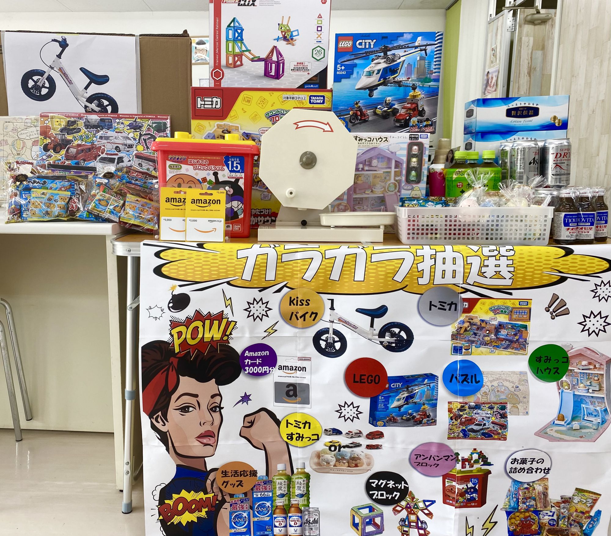 ガラガラ抽選会では、お子様に大人気のキッズバイクやブロック、お菓子など