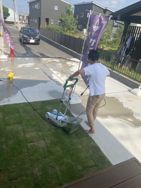 左手には芝刈り機、右手にはケルヒャーを持ち