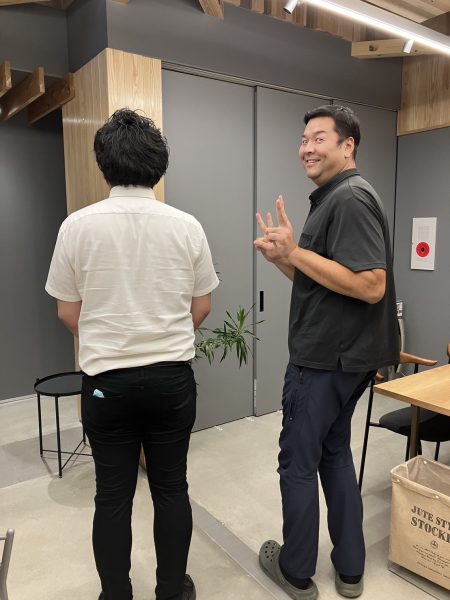 写真は左の白シャツです。身長も高く横幅も広く顔も濃いので威圧感がありますが威圧しているつもりもなく自称穏やかな性格だと思っておりますので、