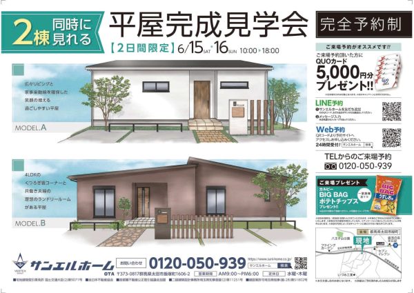 場所は太田市で人気の平屋が2棟同時にみれるイベントとなっておりますので