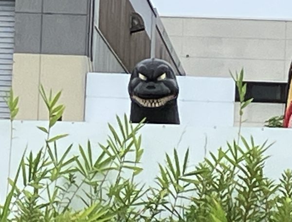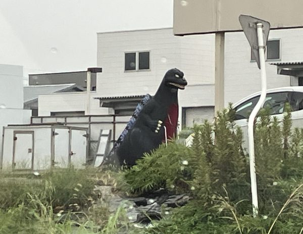 現地へ向かう途中、あの有名な怪獣王に遭遇しました。