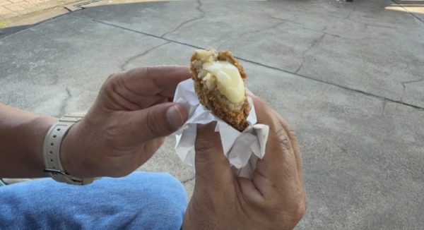 自分も名前は聞いたことはありましたが、それがどういうものか食べたことが無くてその謎を解明するため新町にあるフレッシュミートまつしまさんにいき、揚げたてのオランダコロッケをいただいてきました。