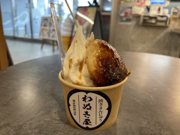 香ばしい焼きたての焼きまんじゅうとソフトクリームの相性はバッチリでした。
