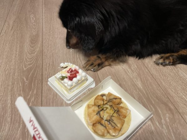 誕生日のお祝いの犬用のケーキとピザをものすごい勢いであっという間に食べてしまいました