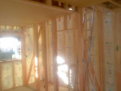 こんにちは。工事の小林です。E様邸の工事の進捗です。外は、明日から外壁工事を行なう予定です。内部は石膏ボード貼りを行なっています。