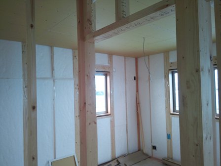 こんにちは。工事の小林です。S様邸の工事の進捗です。断熱材施工フローリング施工が終わって石膏ボードを貼り始めています。外部はALCのコーキングが終わって養生をしています。来週初めから塗装吹付工事を開始します。