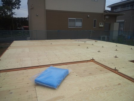 こんにちは。工事の小林です。行田市のT様邸の床組が完了しました。この後はシートで養生をして作業終了です。明後日が上棟です。明日は足場の工事をします。