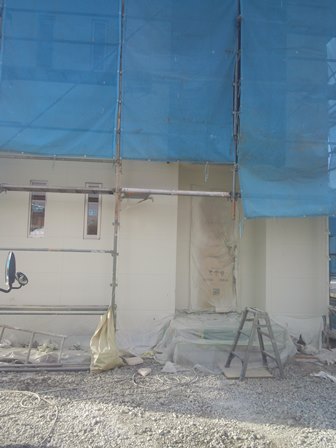 こんにちは。工事の小林です。行田市のH様邸の工事の進捗です。外は塗装吹付工事中で、明日終わります。足場の解体は来週の火曜日を予定しています。