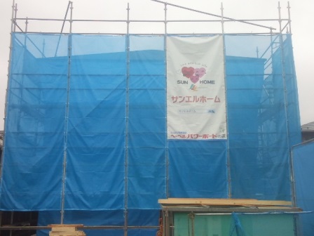 こんにちは。工事の小林です。М様邸上棟しました。写真は上棟後に物やごみが飛散しないように養生ネットを施工した状況です。また当社のイメージシートも新しいものになっています。