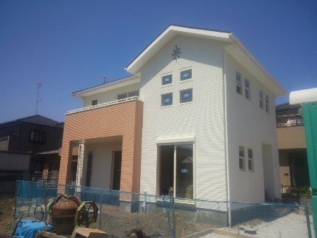 こんにちは。工事の小林です。行田市の城西モデルです。あと少しで完成します。外は外構工事を行っています。中はクロス工事が明日完了します。