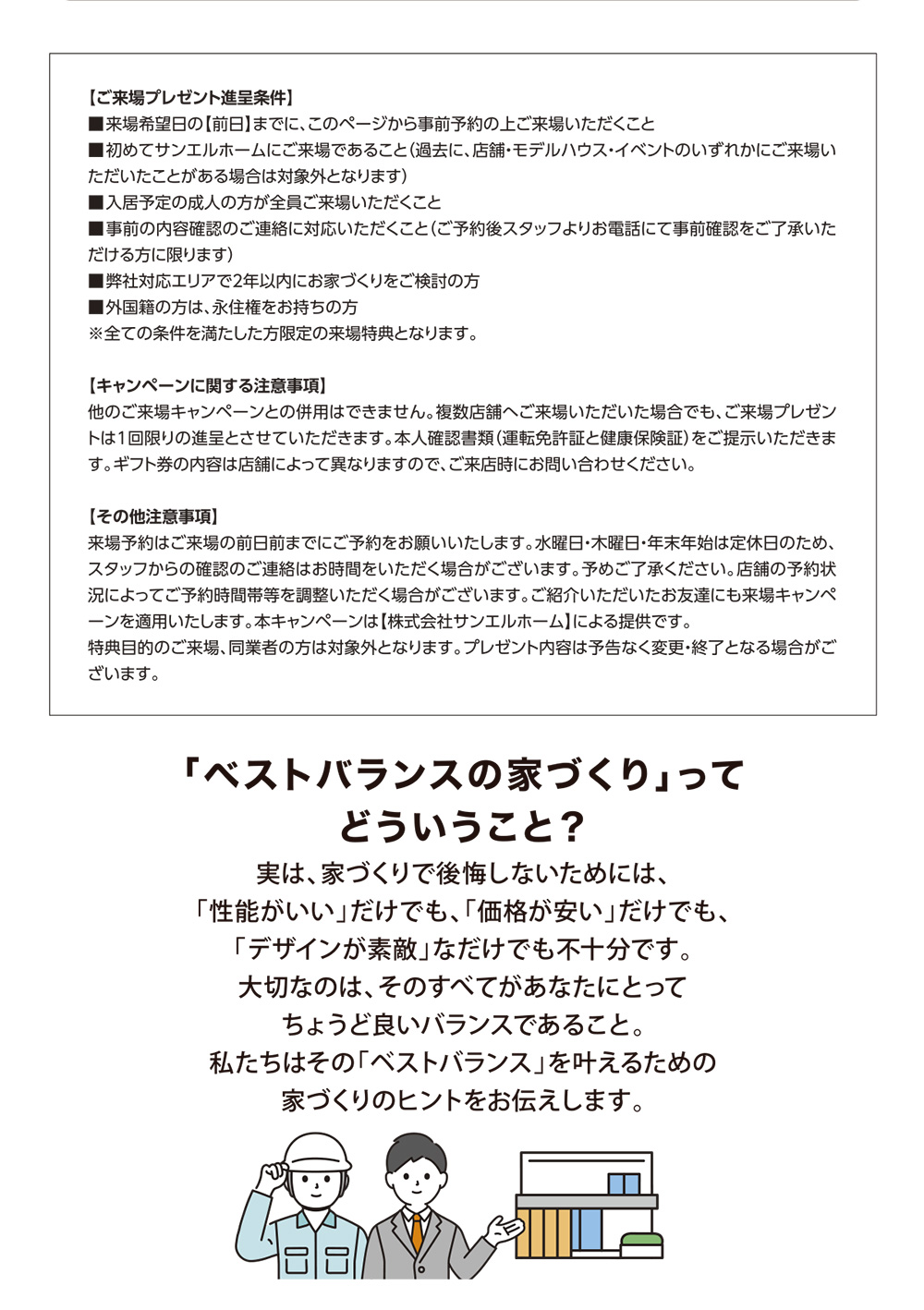 ■初めてサンエルホームにご来場であること(過去に、店舗・モデルハウス・イベントのいずれかにご来場いただいたことがある場合は対象外となります)