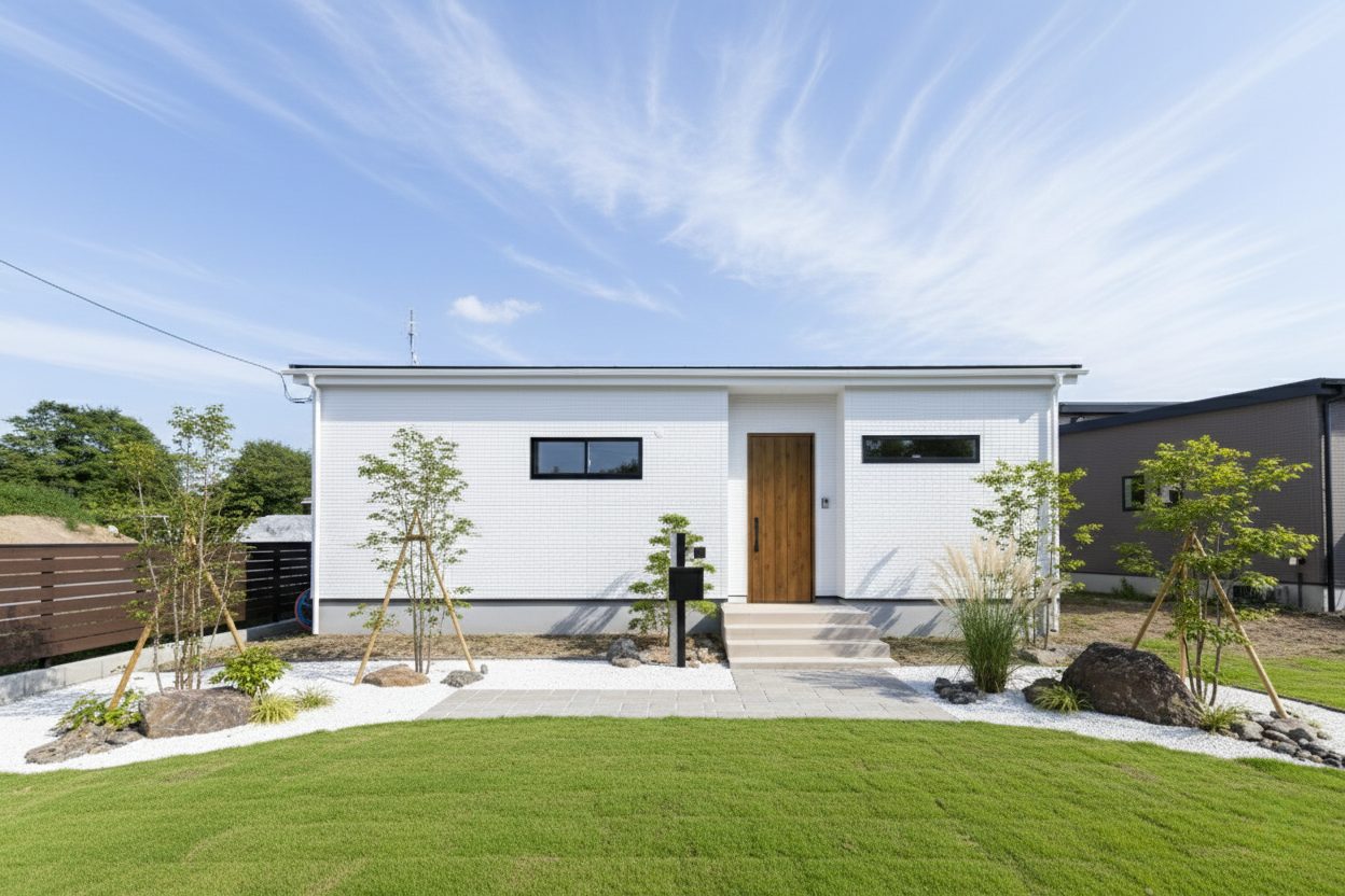 白い壁と木の質感を感じられる玄関ドアの平屋