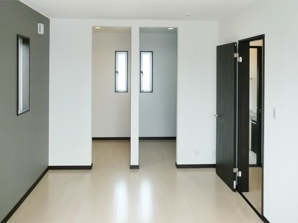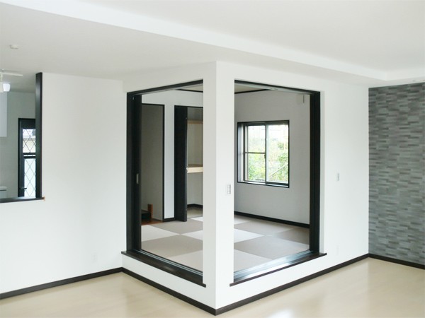 2面の扉が開くピンク畳の和室とLDKのエコカラット(タイル貼り)がカッコイイですね!旦那さんの身長が高いので、天井も部分的にあげてます!
