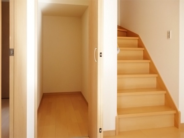 リビングイン階段の横には奥行のある収納スペースを確保☆たっぷり入るのでリビングもスッキリします。 -