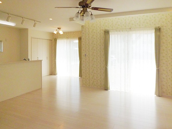 こだわりのグリーンのクロス。家族団らんの広々リビングを優しく包んでますね。 -