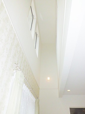 吹き抜けと洋室の間に内窓を設けました。内窓を開けるとリビングがのぞけます。 -