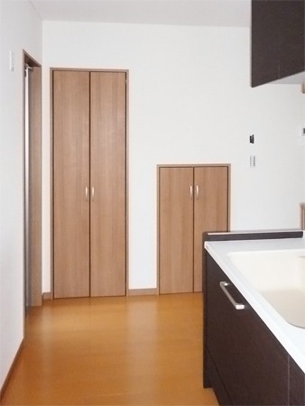 キッチンの横にたっぷりの収納スペースがあります☆生活用品もたくさん入るのでリビングも広々使えます。 -