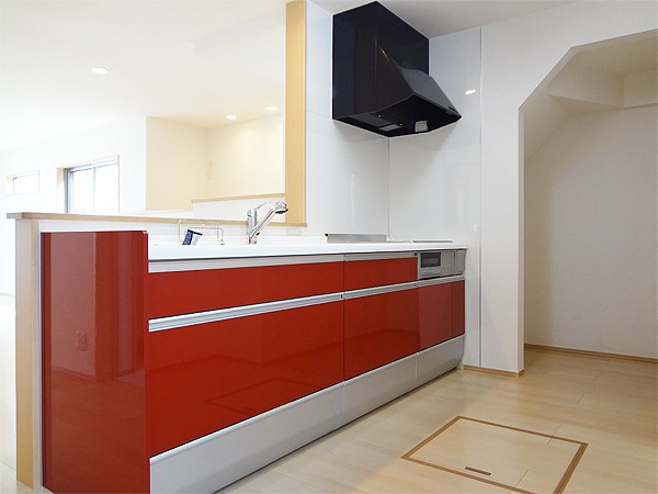 対面キッチンです!奥は階段下を有効活用して収納スペースにしました!