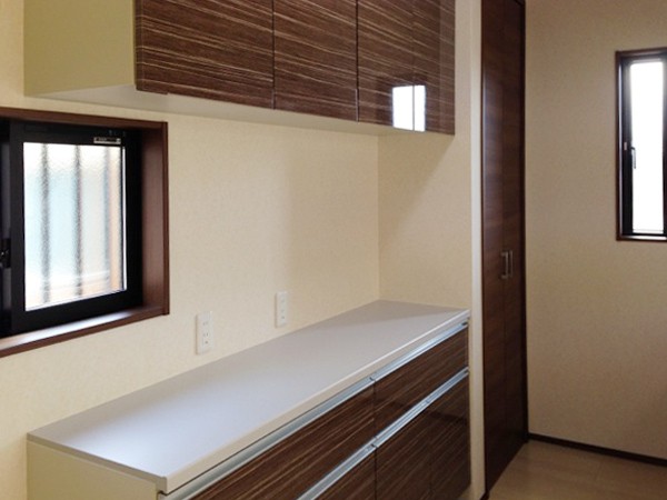 落ち着いた色のキッチンですね。食器洗浄器も付いています。