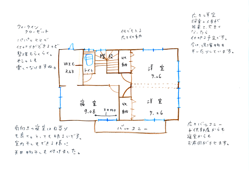 今は、家族みんなで1階の和室に寝ているのですがもう少し子供が大きくなったら遊んだり、お勉強したりキッチンから見えるのでいいですね。