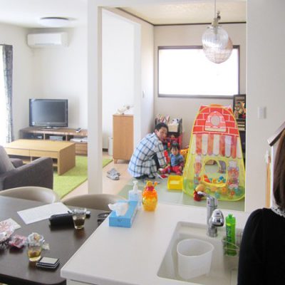 広いしやわらかい床にしたからタク(お子様)転んでも大丈夫だしね。むしろ転ばなくなったね、滑らないから。アパートではツルツルしてたけど…繋がってるからすぐ暖かい部屋に行けるし、すごいラク!|埼玉県の土地・不動産・オシャレな注文住宅